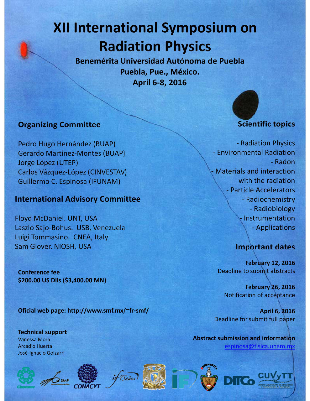 Enclosed you will find the first information (scoop) for the "XII International Symposium on Radiation Physics", to be held in the Benemerita Universidad Autonoma de Puebla, in Puebla, Mexico., from 6 to 8 of April, 2016.